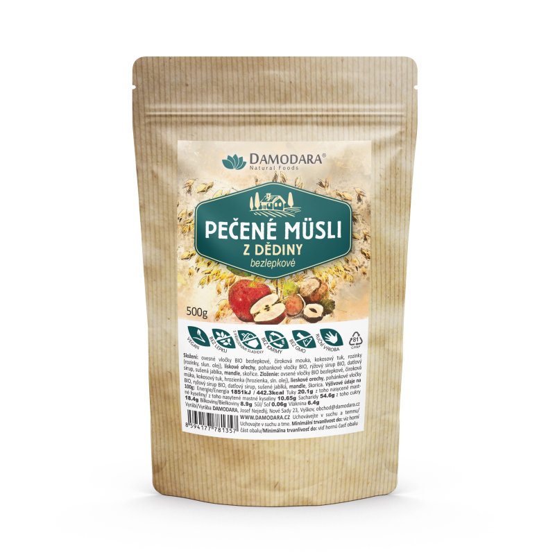 Složení: ovesné vločky BIO bezlepkové, čiroková mouka, kokosový tuk, rozinky (rozinky, slun. olej), lískové ořechy, pohankové vločky BIO, rýžový sirup BIO, datlový sirup, sušená jablka, mandle, skořice .. Výživové údaje na 100 g: Energie 1851 kJ / 442,3 kcal, Tuky 20,1 g, z toho nasycené mastné kyseliny 10,65 g, Sacharidy 54,6 g, z toho cukry 18,4 g, Bílkoviny 8,9 g, Sůl 0,06 g, Vláknina 6,4 g .. Vegan | Bez lepku | S přírodními sladidly | Bez karmy | Bez GMO | Ruční výroba